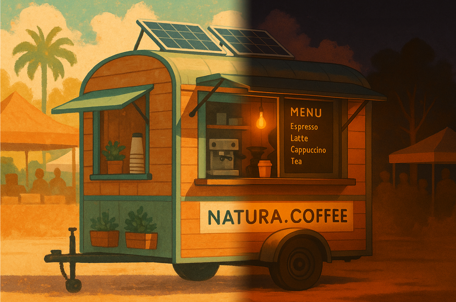 A wooden coffee truck with solar panels on the roof between day time and night time, with a menu featuring espresso, latte, cappuccino, and tea, labelled 'NATURA. COFFEE', in an outdoor market with tents and people in the background.